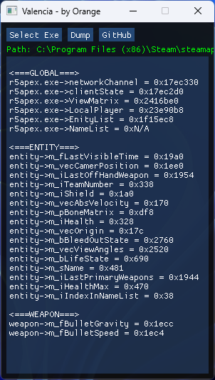 Valencia is a utility designed to extract offsets from Apex Legends by performing signature scans. This tool is useful for developers interested in game modification and reverse engineering.